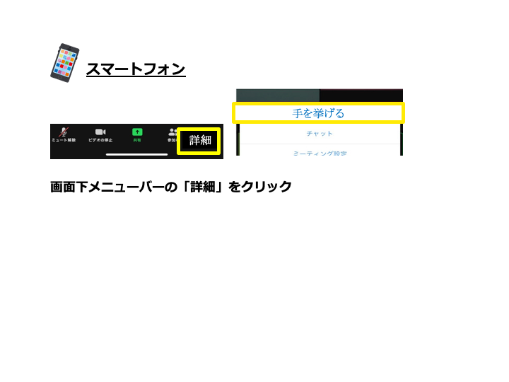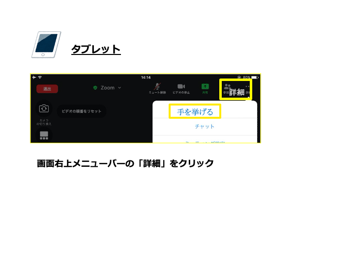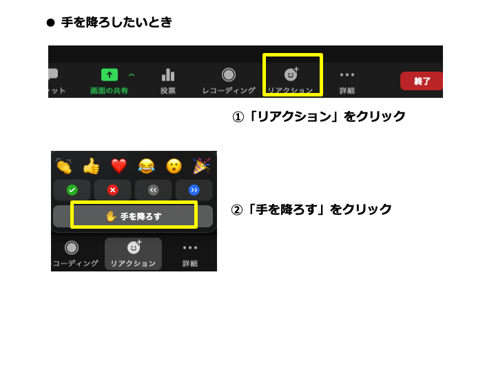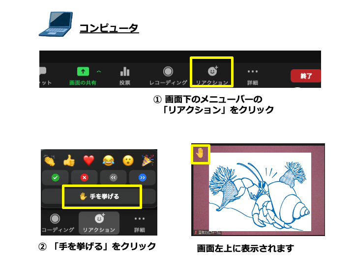 この講座では、自分の作業が終わったときの合図として、「手を挙げる」ボタンを使用します。
