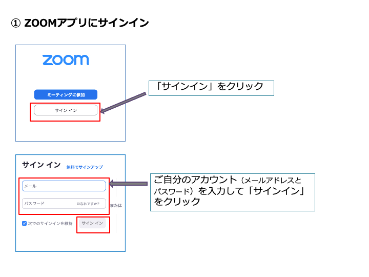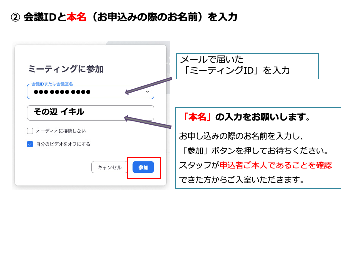 ●ZOOMアプリでサインイン(①)した後、講座直前にメールでお送りする会議IDと本名をご入力(②)のうえ入室してください。
