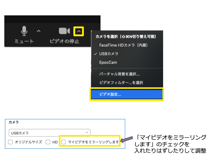 「マイビデオをミラーリングします」にチェックを入れる。または、チェックをはずす。