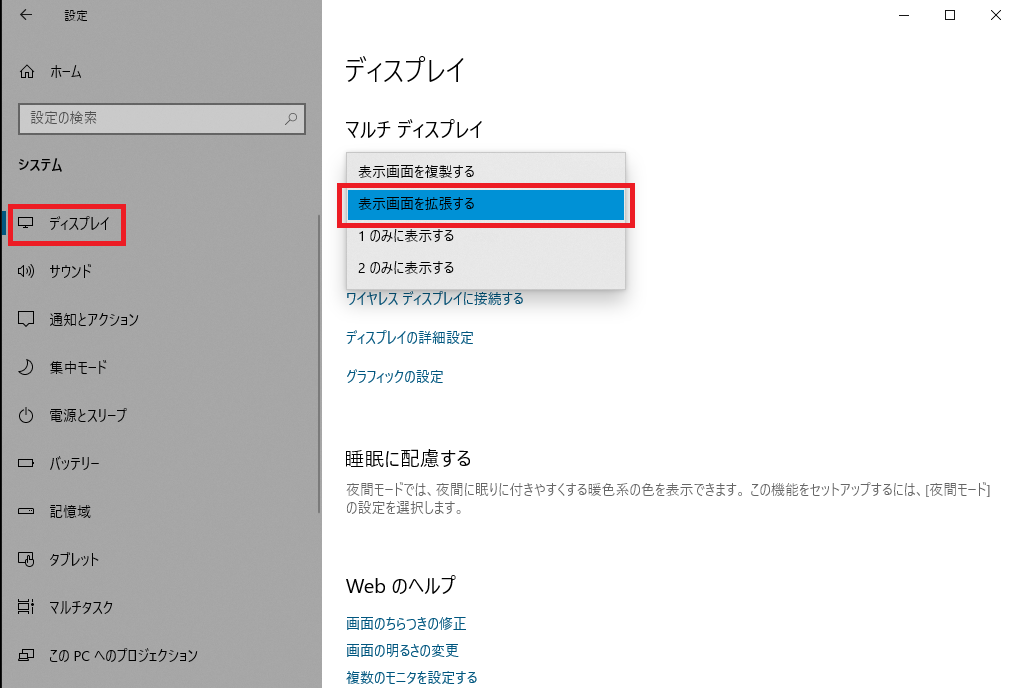 『設定』→『システム』→左側のタブ『ディスプレイ』→マルチディスプレイ(の「複数のディスプレイ」から)『表示画面を拡張する』を選択