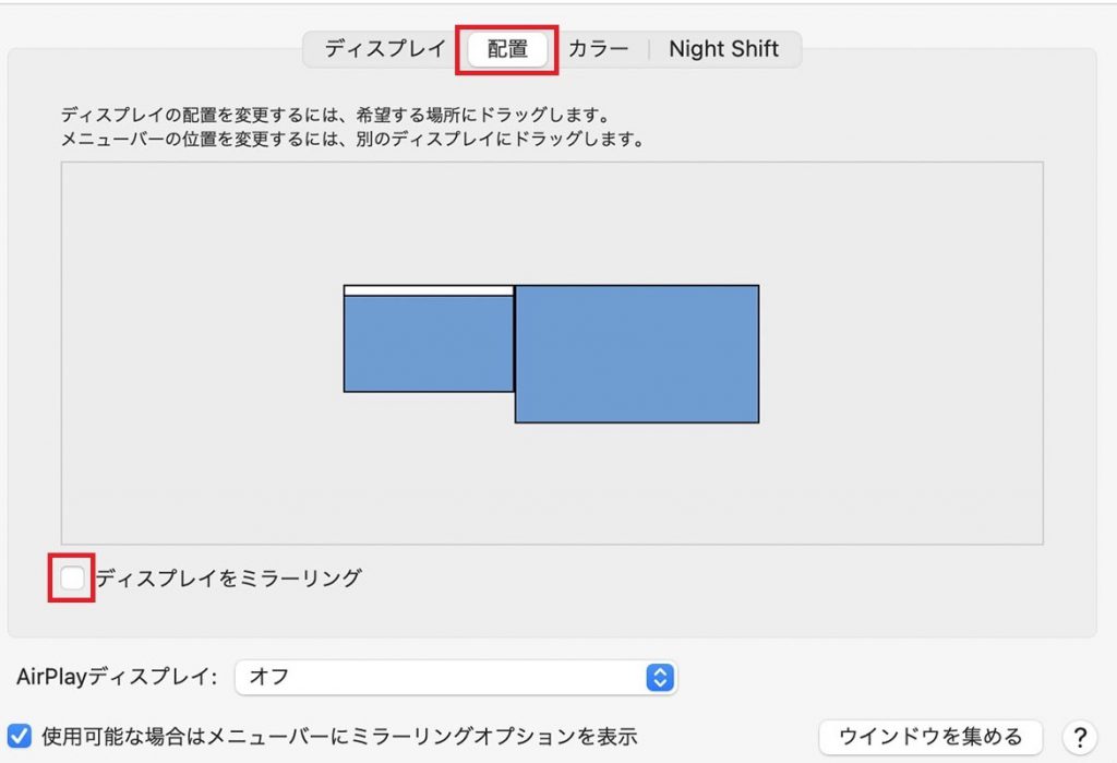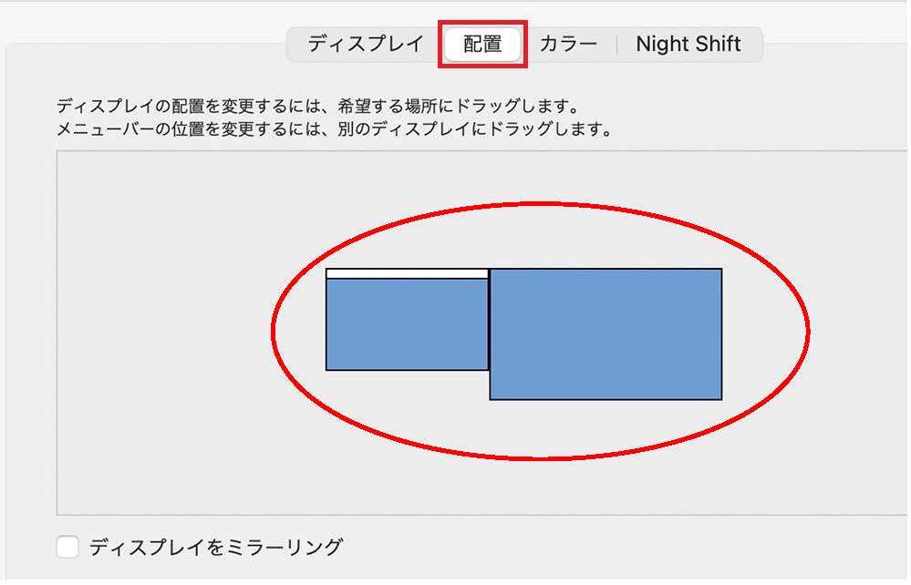 1と同じ設定画面(『システム環境設定』→『ディスプレイ』→『配置』)で、モニターの位置を実際のコンピュータとモニターの配置と同じになるように動かす(ドラッグする)。