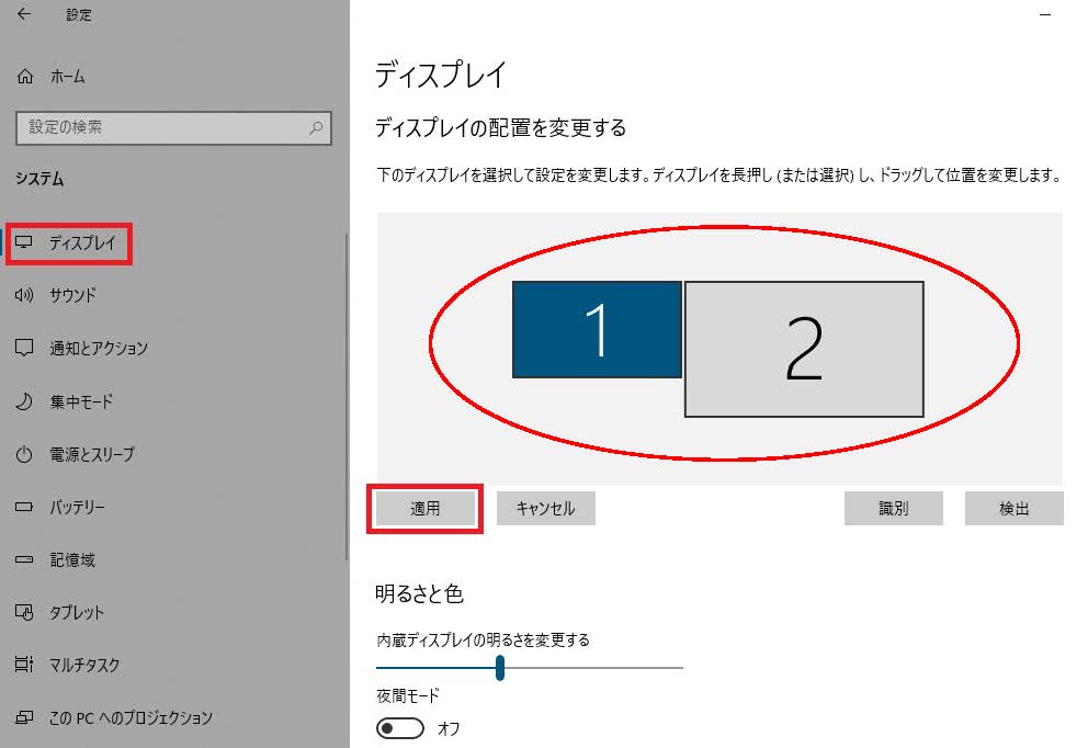『設定』→『システム』→左側のタブ『ディスプレイ』→『ディスプレイの配置を変更する』で、ドラッグでモニターの位置を実際のコンピュータとモニターの配置と同じになるように動かす→『適用』