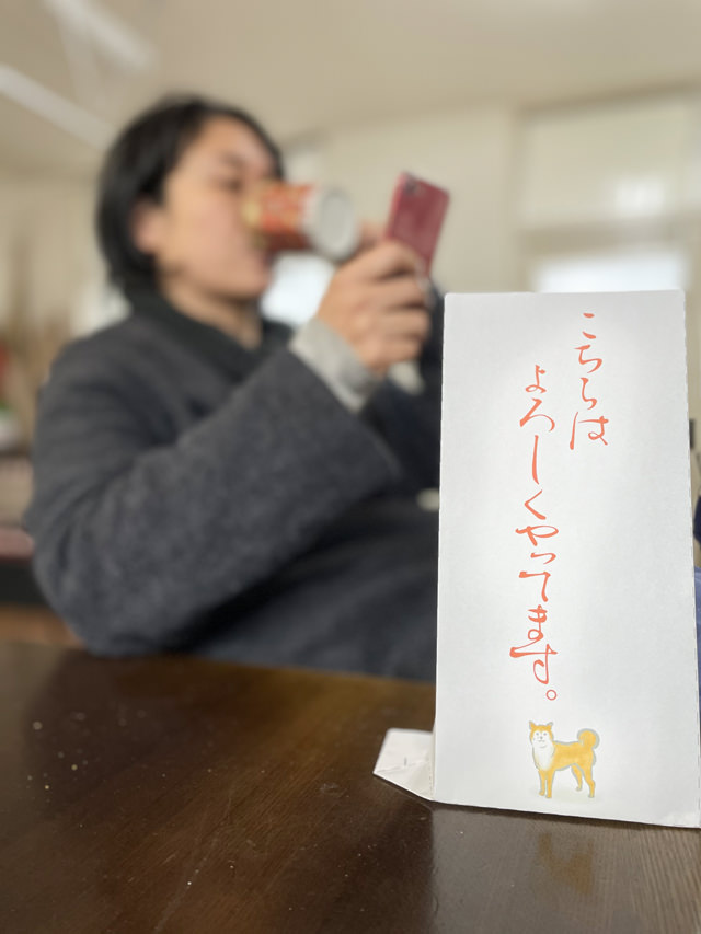 「こちらはよろしくやってます」ボードを画面の前に掲げます。