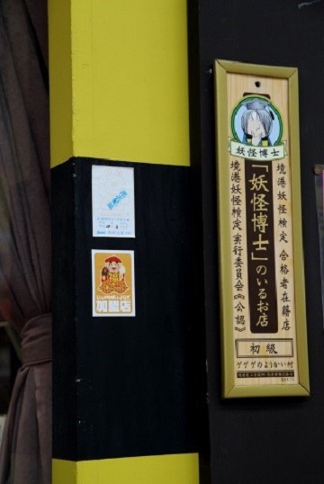 The businesses along Mizuki Shigeru Road post signs like these. [left: Certified Yokai Expert in this Shop]; right [in front of a bank]: "Never reveal your pin number though you may be asked by a yokai in the vicinity of this ATM."