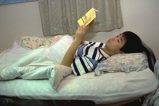 Before I go to sleep I usually read for a while. I like reading books about wild birds and nature. And I love fiction, too, especially mysteries by Akagawa Jiro. My favorite is Futari [The Couple]. If I find an interesting book at the bookstore, I often buy it. I often read books that people are talking about or that are popular among my friends. I read the manga weekly magazine but not many other manga.