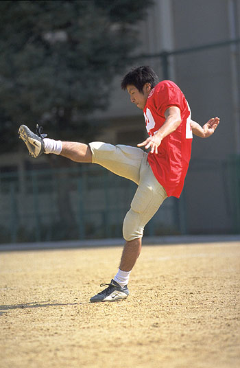 We have practice pretty much every day except for the day following a game and during exam periods. Each practice session lasts about three hours. The club has around fifty members. In addition to the head coach there are eight coaches and two trainers, and we also have a support group made up of players' parents. During the playing season practice focuses on game strategy, and in the winter we concentrate on improving our overall fitness by running, weight training, and so on. Everyone on the team gets on really well, so even the toughest practices are fun. I go in there determined to show how good I can become. I love football and never feel like cutting practice no matter how grueling it gets.