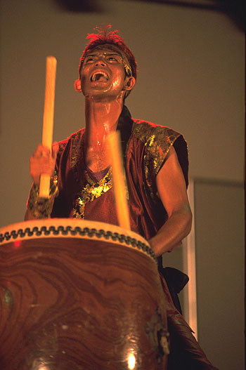 이제나 쇼엔다이코는 결성된지 12년이 되었습니다. 멤버는 중학생에서부터 어른까지 35명정도입니다. 저는 중학교 2학년 때부터 참가하여 지금까지 이제나지마*1와 오키나와현*2내 각지의 이벤트에서 연주하고 프랑스의 민족음악제에도 참가했었습니다.