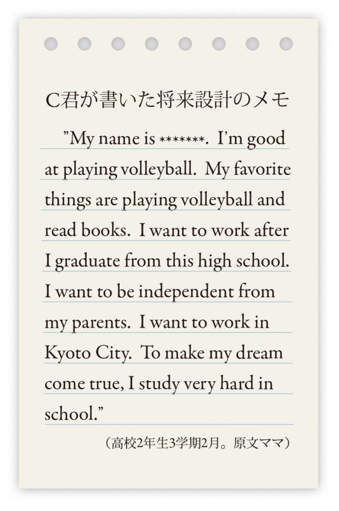 Cくんはメモ(右図)を手にALTの先生とのインタビューに臨み、“Why do you like to work in Kyoto city?”と尋ねられて、“Because I like the city.”と答えるなど、意欲的に応答していました。インタビュー直後の彼の晴れ晴れとした表情からは、「自分の発話がきちんと聴きとられ、それをもとにして応答できた」という成功感・満足感が見てとれましたし、その後の英語学習でのCくんのスッと伸びた背中が彼の変化を物語っていました。「うーん、なんか突然オープンしたんすよ」ということば通り、彼のなかでドラスティックな変化が起きたようでした。「自ら思考判断し、意見を発信する力」を育てる授業には、発信への意欲を持てる言語活動と、その活動に取り組める力を育てる教科指導が必要ですが、その両輪がうまくかみ合うとき、生徒は発信する行為を通じて当の教科力を自ら高めていくのだということをCくんの例が物語っています。