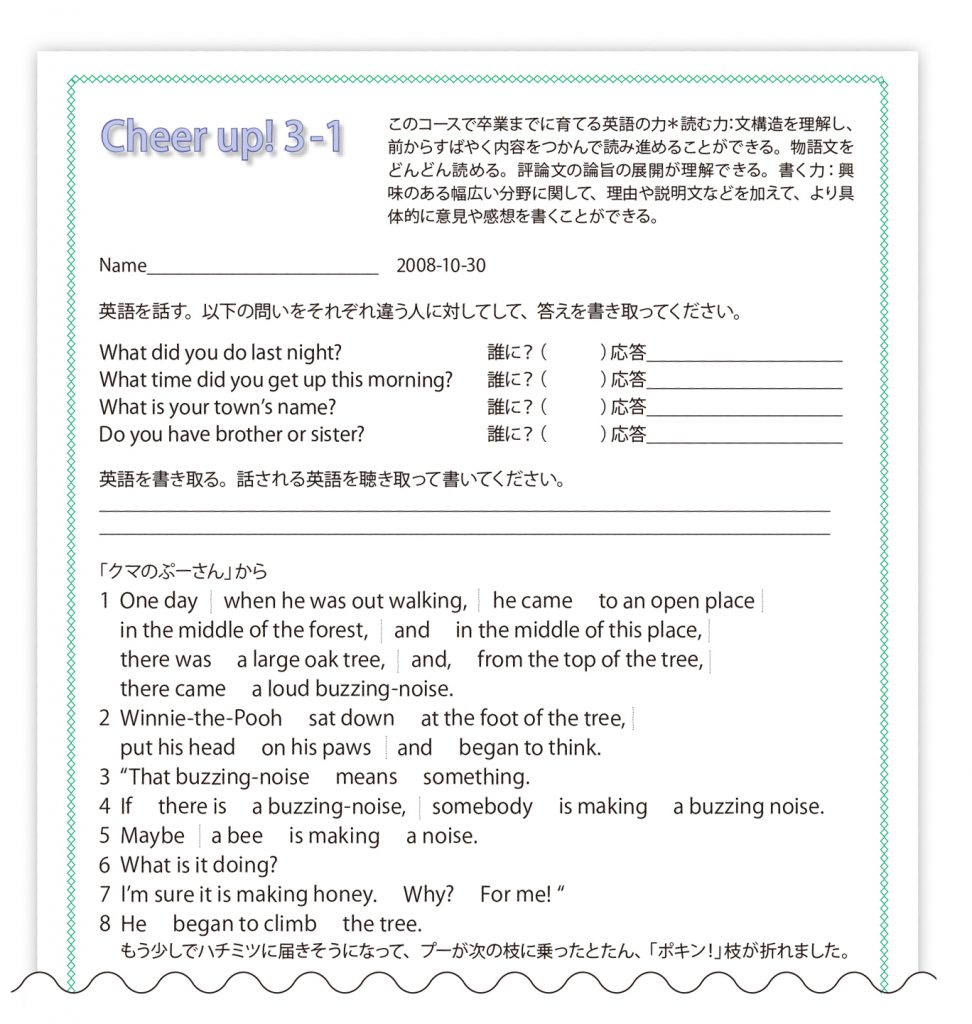 一見してごく単純な言語活動にもかかわらず、そこには生徒たちの生き生きと取り組む姿があり、ここにその後の授業展開への大きなヒントがあったのです。言語活動が生徒にとって現実感のあるものであれば授業が生徒に関わりのあるものとなり、授業の場が生徒の主体的な居場所となるのだ、という気づきを得た瞬間でした。