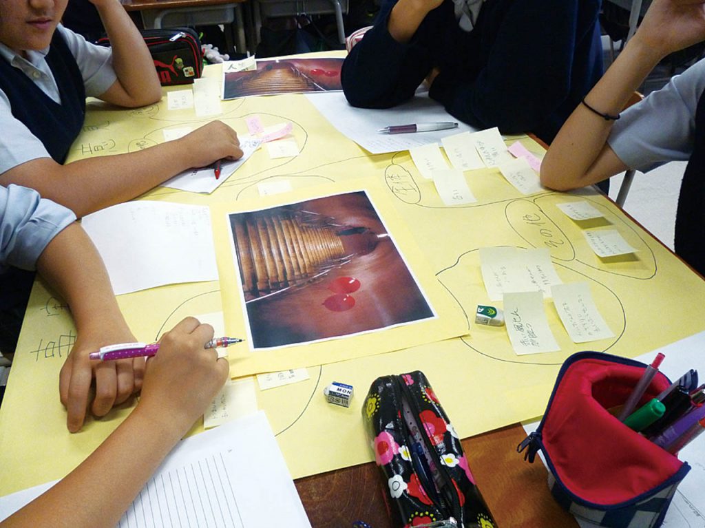 中学二年生では、集めた情報の分析方法をトレーニングする。基本はグルーピングである。分類基準を決め、同類項をまとめたり、階層構造を構築したりする。例えば、文房具のもつ意味合いについて分析するために、「シール」を取り上げる場合、四〜五人の班をつくり、「シール」とはどのようなものかを各自で付箋に書き留める。一枚の付箋に一項目を書き、できるだけ多く書き出す。各自が書いた付箋を班ごとに大きな模造紙に貼り出す。ここからグルーピングしていく。共通項を全員で見つけながら、似ているものをグループごとにまとめるのである。生徒たちは「シール」のもつ役割や意味などを再認識したり、思いもよらなかった点に気づいたりする。