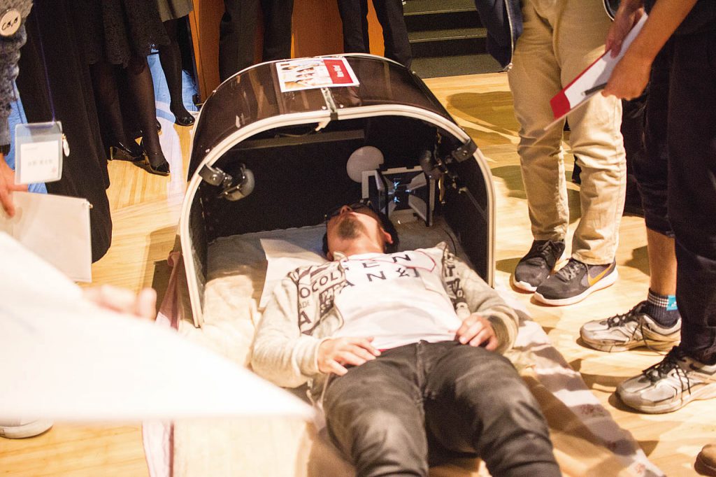 2017年は、全国250名の応募者から選ばれた150名の中高生が参加しました。7社の企業から出された「家庭の食品ロスを解決する○○とは」「中高生が欲しくなる〝いまだかつてない〟まほうびん」など5つのテーマのなかから、挑戦したいものを選び、4人程度のチームをつくって6日間の予選プログラムに取り組みました。予選を勝ち抜いた5チームは、約4ヵ月かけて、出題した企業のスタッフと一緒に議論を重ね、テストを繰り返して本格的なプロトタイプを制作し、決勝大会にのぞみます。優勝したのは、「誰かと、何かと、『つながりたい』気持ちを叶えるモノ」というテーマに挑戦し、離れた親友と時空間を共有できるドーム型デバイス「COVO(コーヴォ)」を発案したチーム。長期入院している女子中高生とその親友に、物理的・精神的な距離が生まれてしまうという具体的な課題を設定しました。ベッドに寝たまま頭の上にドーム状の器具をかぶせると、親友がまるで隣に寝ているかのように立体的に映し出され、二人だけの特別な空間を楽しむことができるというプロトタイプをつくりました。