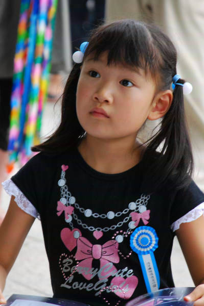 在广岛和平纪念公园,一边手拿《祯子和千纸鹤》的图画书,一边拼命观看连环画剧的女孩。