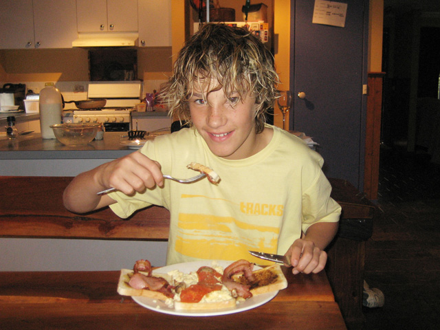 ぼくは週末によく料理をします。今、作っているのはトーストの上にスクランブルエッグをのせた料理です。これは、簡単に作れるから好きです。
