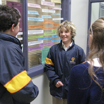 休み時間に友だちと廊下でおしゃべりをしているところです。