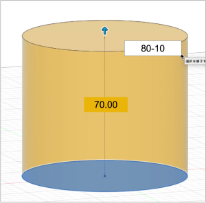 講座では数値ボックスに70mmと入力して高さ70mmの円柱を完成させました。数値ボックスには、上の図のように計算式を入れることもできます(80mm-10mm=70mm)。