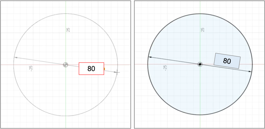 マウスを動かしながら直径を調整することもできますが、数字が表示されるボックスに直径の数字を入力して決定することもできます(左図)。今回は直径80mmのコップを作りたいので、数値ボックスに「80」という数字を入力して「enter」キーを押します。すると、直径80mmの青い円が現れました(右図)。青くなったのは「閉じた」円ができた(円が確定された)ということを意味します。3D設計では閉じた図のみを立体化できます。