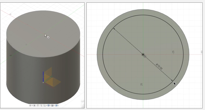 まず、円柱の天面(左図の上の円)に直径70mmの円を作成します(右図)。