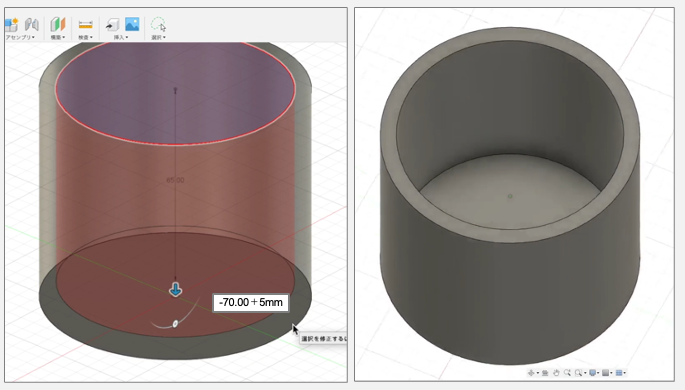 次に、「押し出し」で矢印を下の方に引っ張ります。コップの底の厚さを5mmにしたいので、手動で底が5mm残るところまで押し出しをするか、あるいは、左図のように数値ボックスに「-70+5mm」と計算式を入れます。