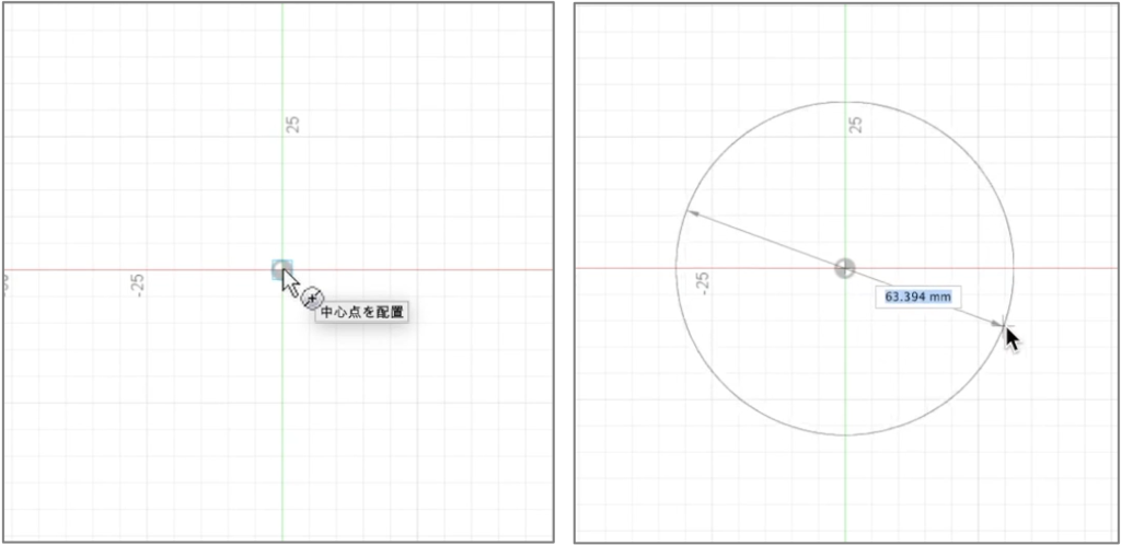 カーソルを画面の中心の点に合わせて1回だけクリックし(左図)、マウスを動かすと円が現れます(右図)。円は、マウスの動きに合わせて広がったり縮んだりします。