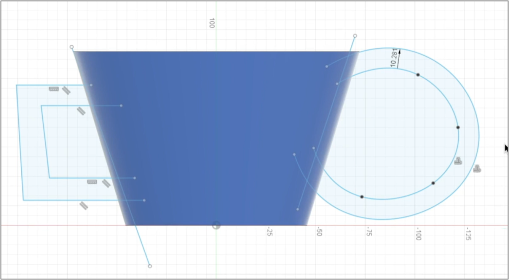 まず平面に取手の設計図を描きます。今回は練習のため、二通りの方法で取手を描きました。左側の取手は「線分」の機能を使って描いたもの、右側の取手は「スプライン」という曲線を描く機能で描いたものです。