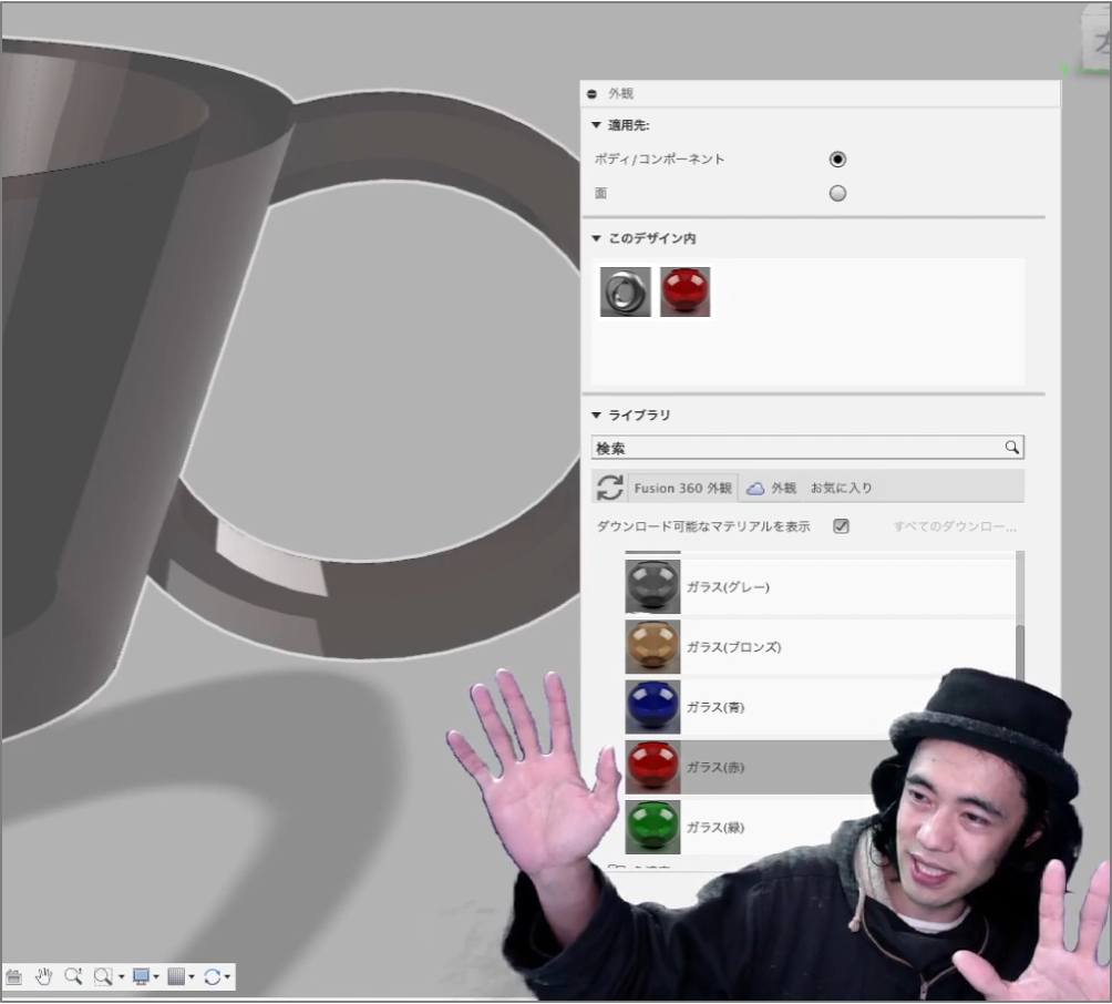 さらに、「レンダリング」というCGを描く機能を使って、コップの素材や色などを選びます。