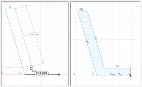 「線分」という機能を使い、マウスを使って「L」という形が少し崩れたような図形を描きます(左図)。これがコップの断面図になります。ここでも、先ほど円を描いたときと同じようにすべての線がつながって図が閉じていることが重要です。図が閉じて確定されると、右図のように青くなります。