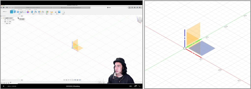 メニューから「スケッチを作成」を選ぶと、画面に面が3つ現れます(左図)。ここで、平面の設計図をどの面に描いていくかを決めます。今回は底の面に描きたいので、底の面をクリックします(右図の灰色の部分)。そうすると選んだ面が平面になって現れます。