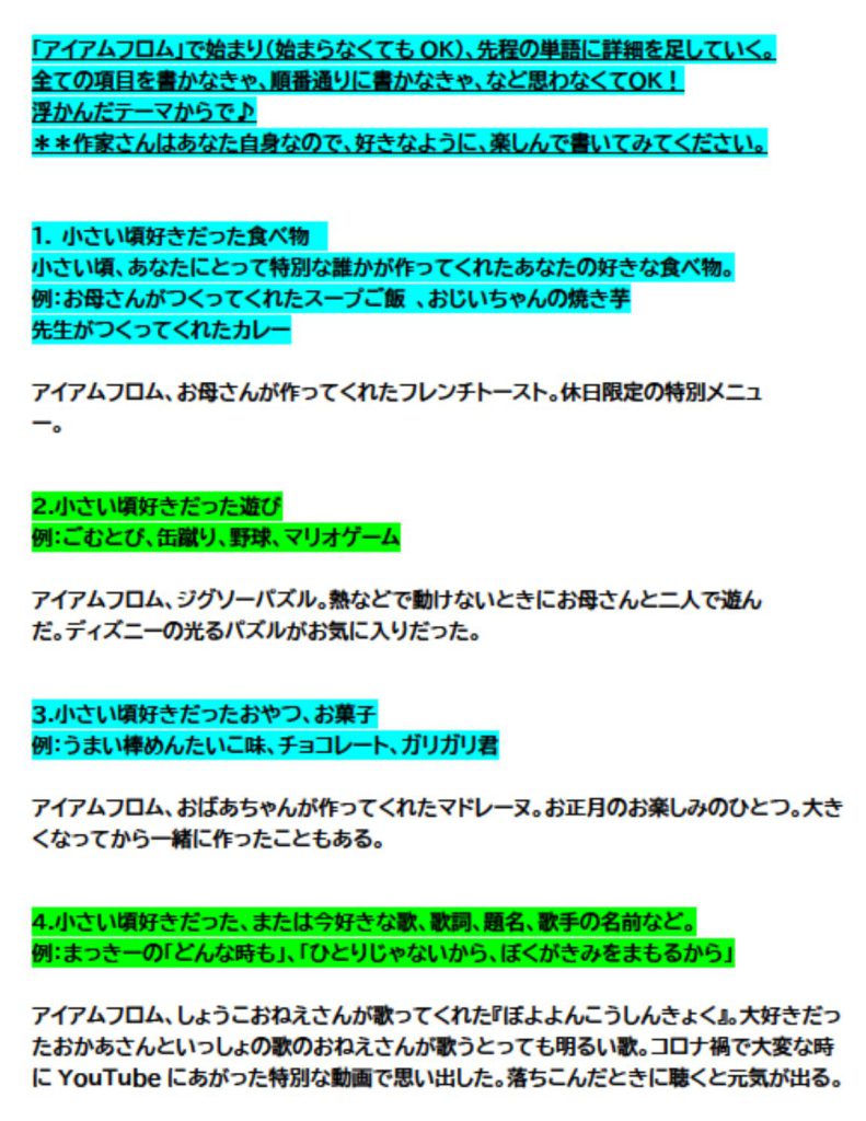子どもの頃の思い出などを辿り、ライフストーリーを探求していく「I am from」のアクティビティを通して、自分を見つめ、過去を見つめ、素材を集めて作品をつくっていきます。
