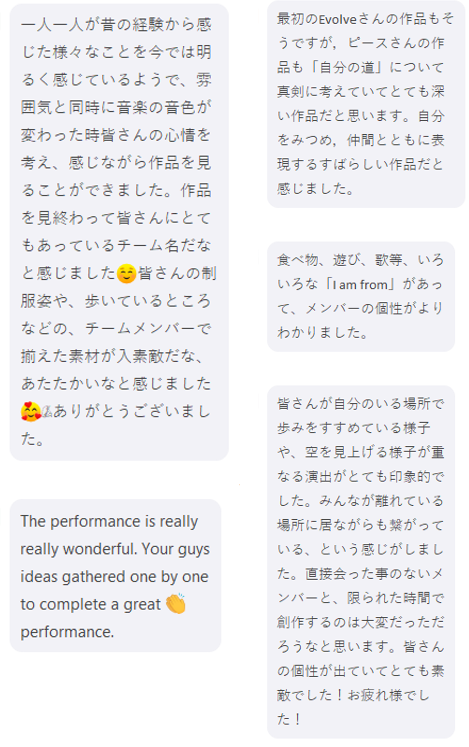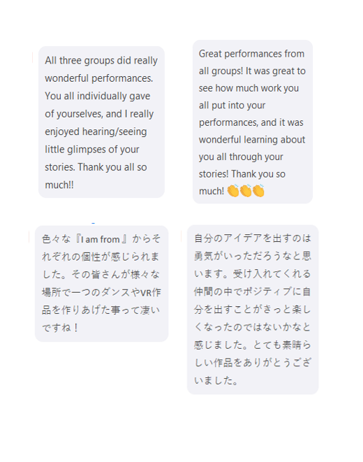 今回の発表会では、各チームの作品が発表されたあとのアフタートークの時間を利用し、見学者の方々にZoomのチャットに感想を送ってもらえるよう呼びかけました。どの作品に対してもたくさんの賞賛、励まし、ねぎらいのコメントが寄せられ、作品やアフタートーク及びプログラム内容が見学者に与えたインパクトが即時に、直接的に、参加者に伝わりました。