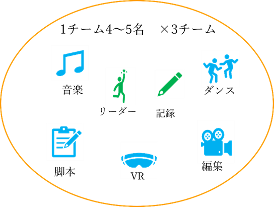 4日め | 午前 午後 | VRまたはZoomで撮影 宿題1:編集担当が素材をつなげて中間発表用動画作品を作成 宿題2:全員がダンスを覚えて踊ったところを動画撮影し提出 |
