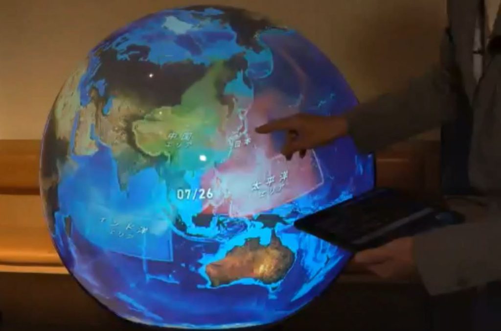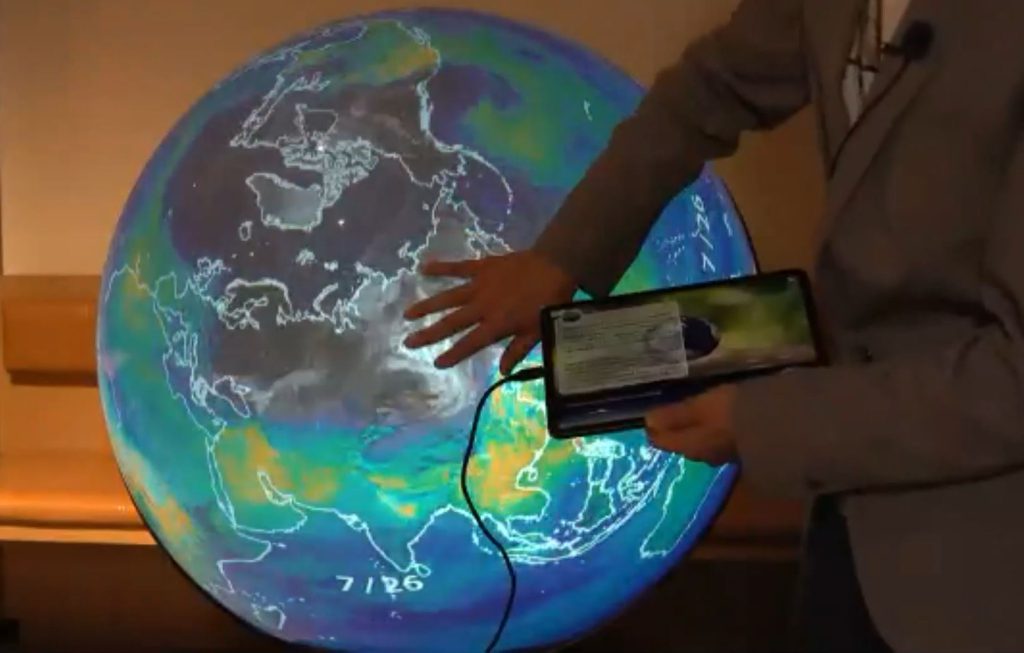 解説: かつて自然発火による火災がほとんどだったのが、現在は、森を食料生産のための畑にする目的で人為的に起こされる火災(アマゾンなど)が増えていることを「SPHERE」による森林面積の減少の様子とともに紹介されました。そして、シベリアの森を例に、森林が温暖化の要因となっているCO2を吸収する様を「SPHERE」に表示し、森林がいかに重要な役割を果たしているかについて言及するとともに、私たちは未来を変えられる時代にいきている、つまり自分たちの選択でよりよい未来を呼び寄せることができると、参加者に向けて呼びかけられました。