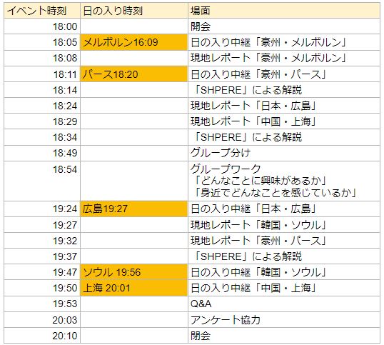プログラムは18:00に開会し、約2時間実施しました。日の入り中継は、オーストラリアのメルボルン、パース、日本の広島、韓国のソウル、中国の上海の順に(日の入りが開会の約2時間前だったメルボルンを除き)それぞれの日の入り5~10分前の様子を現地特派員が中継しました。また、各地の日の入り中継の間に、地球環境にかかわるニュースや身近な変化についても5分程度レポートしました。レポートを受けて講師は、ローカルな話題をグローバルの視点でとらえるとどのように見えるかを「SPHERE」を使って10~15分程度解説しました。プログラムの中盤、グループにわかれて「地球のどんなことに興味があるか」「身近でどんなことを感じているか」などを発表する時間も30分持ちました。