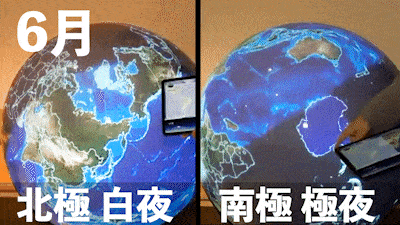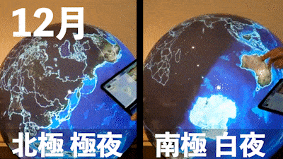 解説: リアルタイムの地球の昼と夜の境(日影線)と、夏至と冬至のころの日影線の様子を「SPHERE」を使って見せてくれました。夏至は北極が一日中明るい白夜の状態にある一方、南極では一日を通して日の当たらない極夜の状態であること。冬至にはその状態が北極と南極で逆転することを「SPHERE」を通じて理解することができました。また、季節がことばや慣習など文化に影響を与えていること(例:クリスマスが、再生した太陽を讃える冬至のお祭りを起源としていること)などを紹介してくれました。