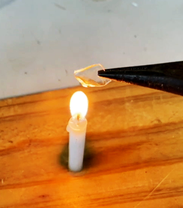 「そしてここで取り出すのがポリエチレンの袋。これは150℃で溶けちゃうんだよ。ほら。それでは130℃前後で当ててみると……ちょっと変形するけど溶けるというか柔らかくなる。つまり、ビカット軟化点。今、皆さんはビカット軟化点を目の当たりにしていますよ!