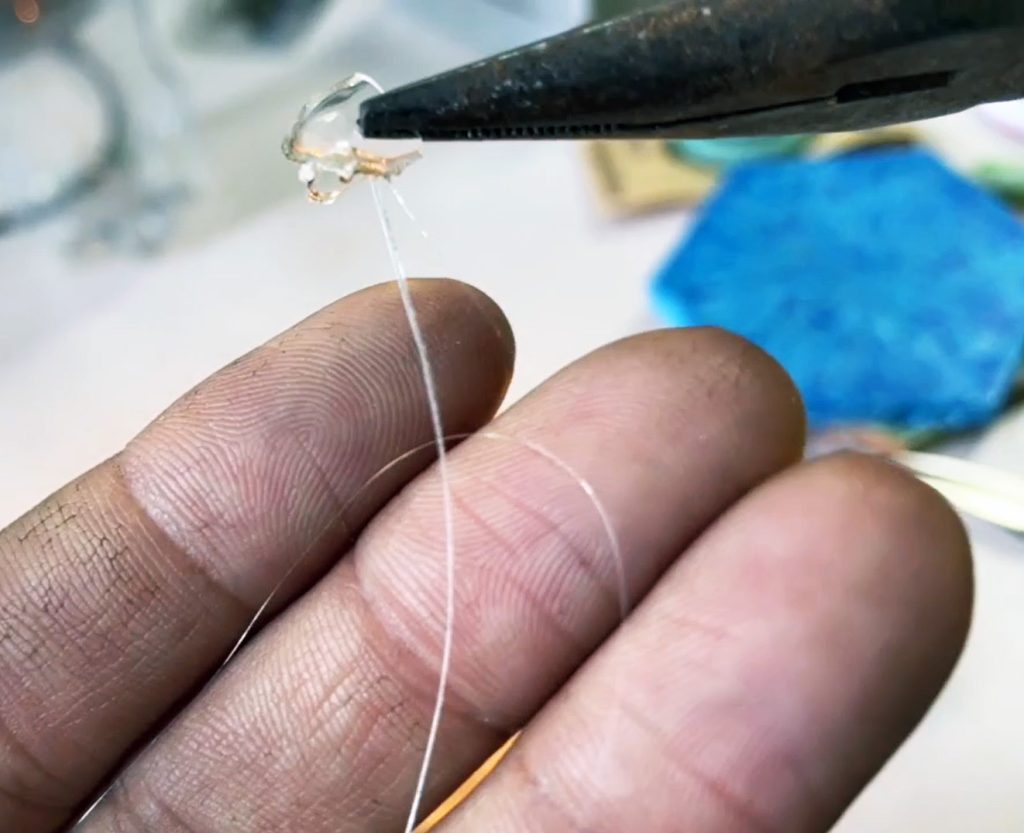 前者はペットボトルのかけらを熱して、溶けかかった瞬間につまんで一気に引き伸ばすと、細く透明感のある繊維ができました。手作りの化繊!