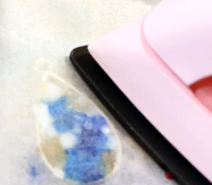 「アクセサリーの枠と、クッキングシートと台をご用意ください。用意する間に、アイロンの目盛りを強にして温めておきます。一番高い温度でいいと思います。アイロンが温まるまでに、枠の中に砕いたペットボトルキャップのペレットを入れる。枠から少し盛り上がるくらいでいいです。そして、アイロンが熱くなったらクッキングシートで覆ってアイロンでプレス! ペレットを溶かしてぴったり枠に収まるように調整します。溢れちゃったらアイロンで角をゴリゴリやれば、余計な部分が切り落とせます。それではやってみよう!」