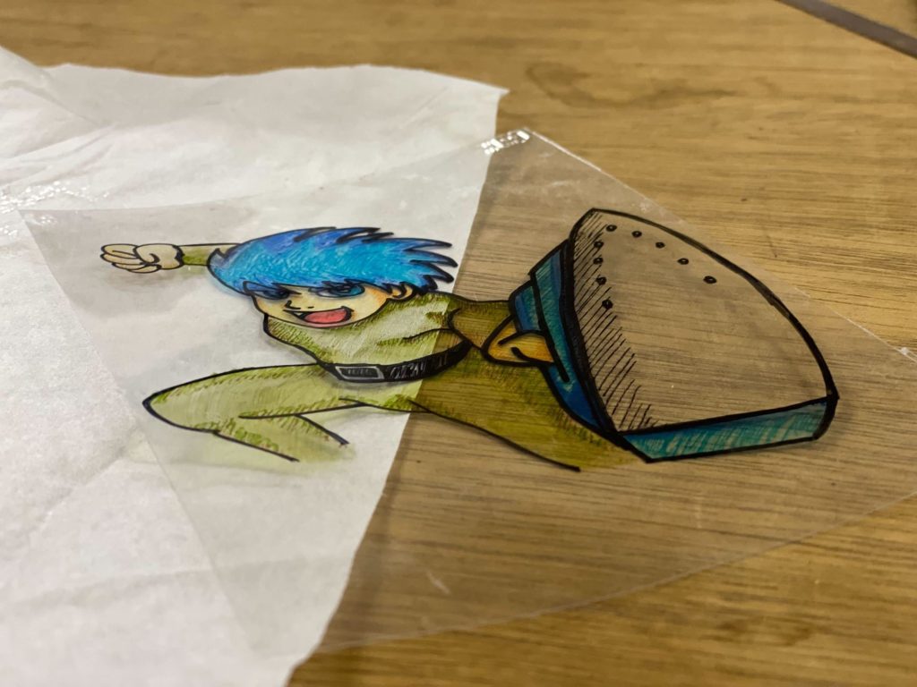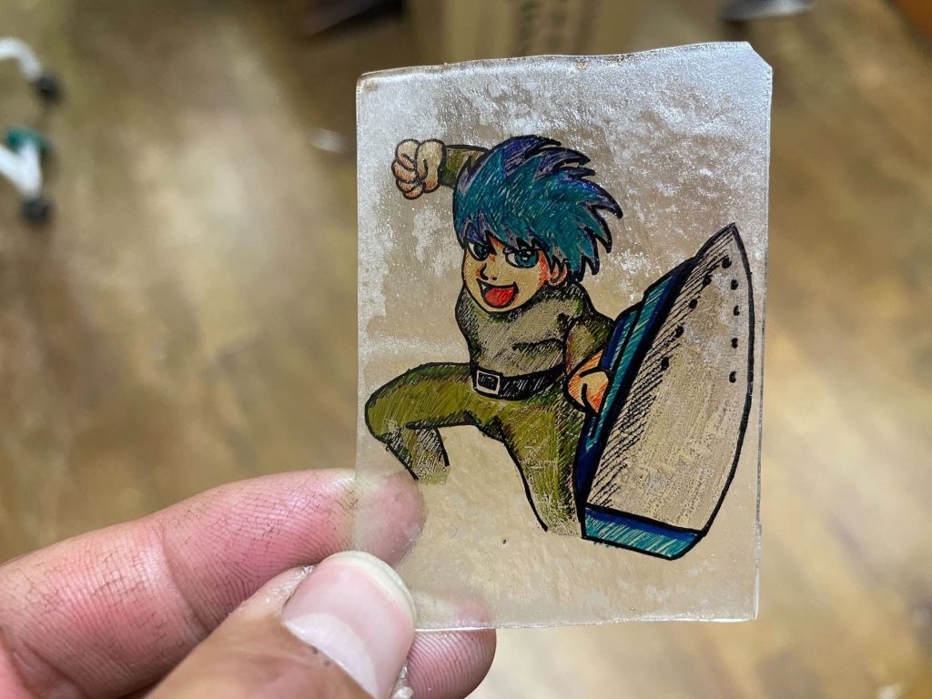 加熱しておもしを載せて成型すること数分、ポリスチレンの板は縮んで、そのぶん厚みが増しています。もちろん、描いた絵もひとまわり小さくなっています。昔ながらの子供の遊び、プラ版と素材も遊び方もまったく一緒、とテンダーさん。
