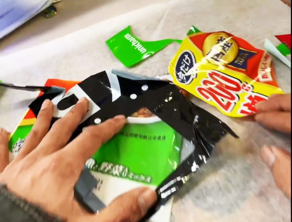 「何でこれを判別する必要があるかって言うと、最初にお見せした通りポリプロピレンとポリエチレンは融点が違うので、同じ温度では溶けない。一番よい方法は『PP』や『PE』と書かれた表記を探すこと。食品包装に使われているのはポリプロピレンが多いですね。ポリエチレンはあんまり高温にするともうみるみる縮んでいくので、思っていたデザインにしにくい。ポリプロピレンでやるんだったらポリプロピレンのみ、ポリエチレンでやるんだったらポリエチレンのみをお勧めします」