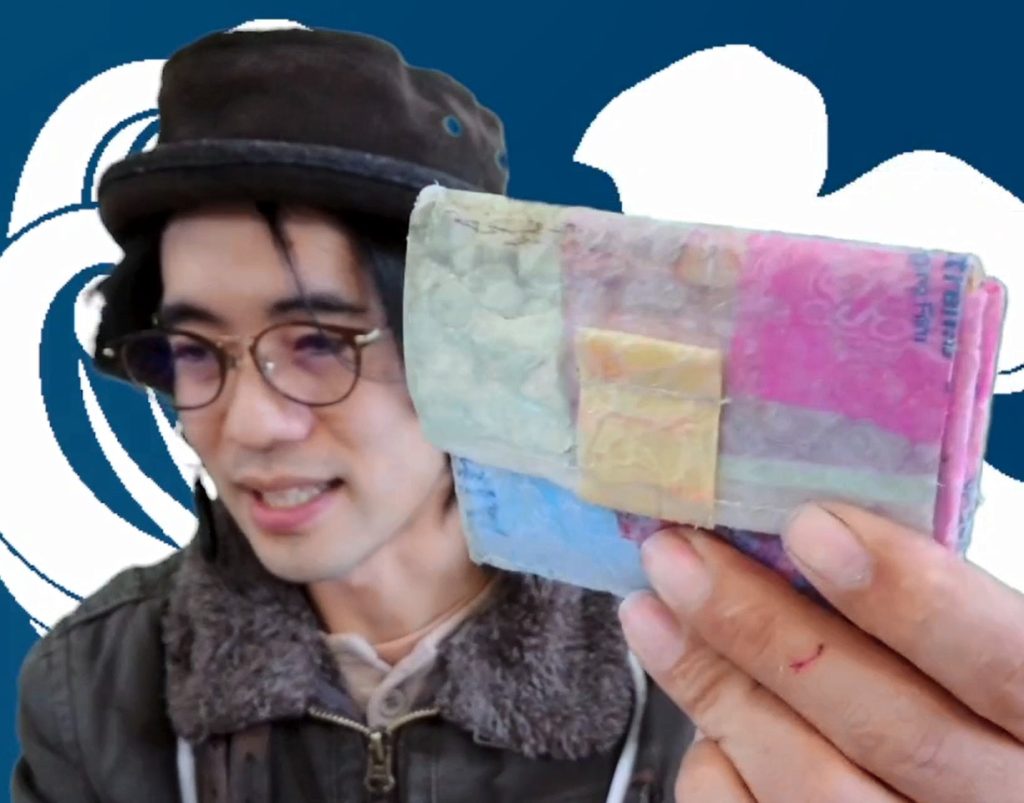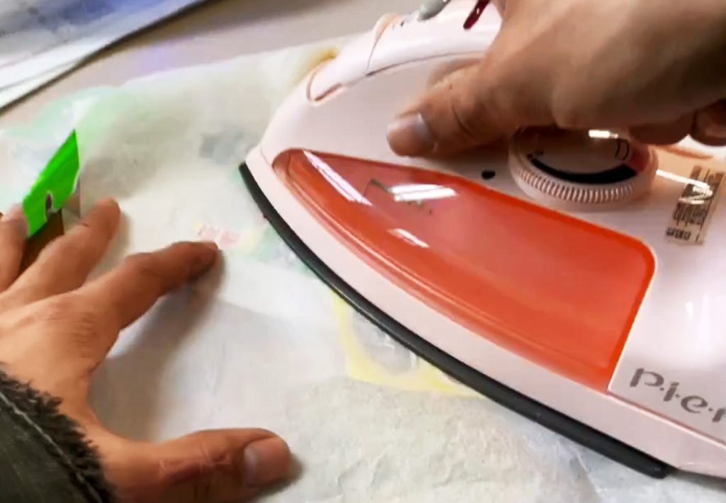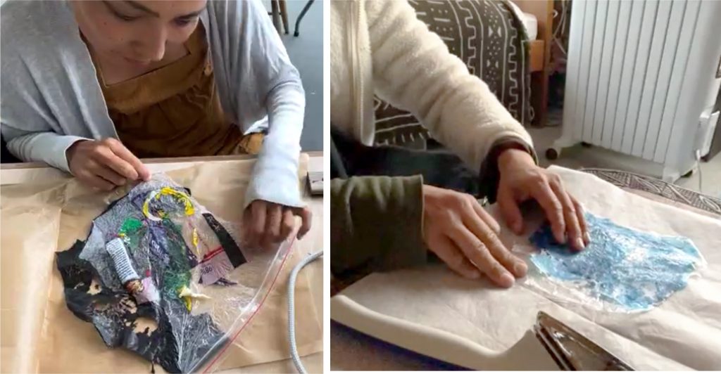 後者は細かく切ったポリエチレンをクッキングシートで覆い、アイロンをかけて1枚のシートにします。シートにしたあとは型紙に合わせて切り出し、カードケースに仕立てますが、注意したいのが素材の選定。ポリプロピレンとポリエチレンの見分けが肝心だ、とテンダーさん。