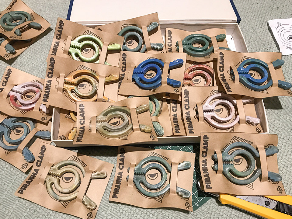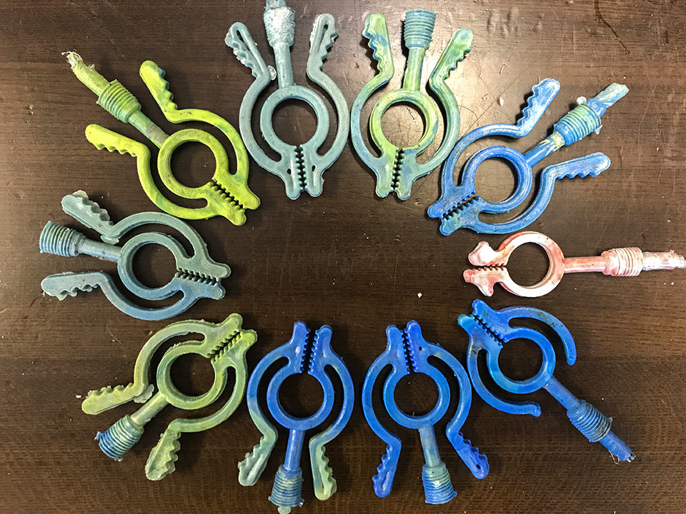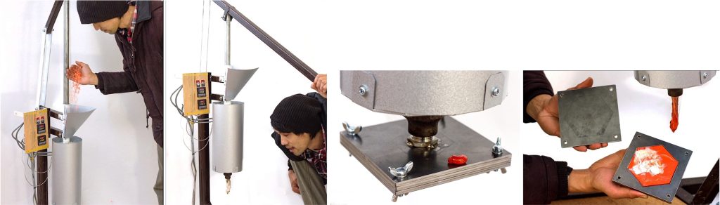 「プレシャスプラスチックがすごいのは、今まで高価だった射出成型機を2〜3万円の材料費で作れて、ゴミから別のものを生み出すところ。砕いたプラスチック片を上から入れ、温度調整機能のあるヒーターで熱し、アームを押し下げて溶けた状態のものを金型に流し込んで新たな製品を作り出す。