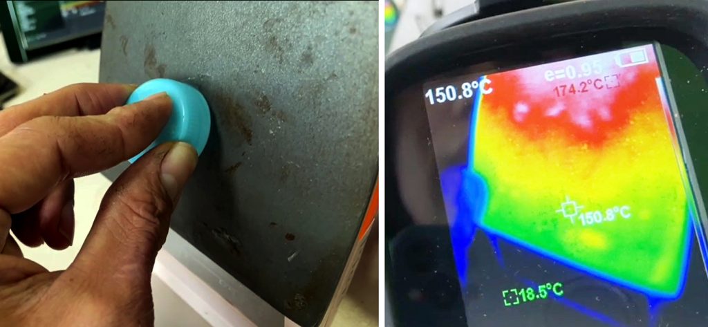 「さて、プラスチックの見分けで使う簡単なやり方はアイロンを使うこと。一般的なアイロンはだいたい200℃位まで行きます。高中低の目盛りで中にすると、だいたい150℃前後位になるでしょうか。そしてこれがサーモカメラ。これで測ると……温度は150℃です。ペットボトルキャップをあてるとネチョーっとはならないけどちょっと変形する、ってことはペットボトルキャップはポリプロピレンだ、とわかる。ポリプロピレンは160℃前後でネチョっとしはじめる。