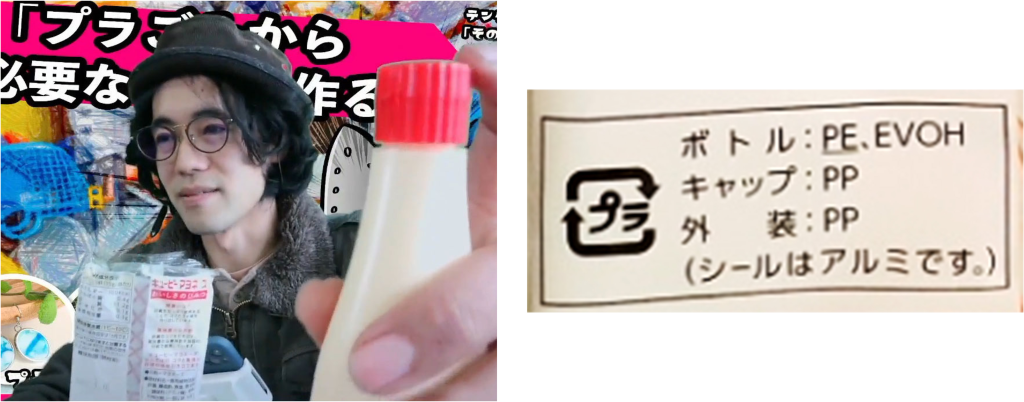 このマヨネーズの袋もポリプロピレンって書いてある。表記を見るとボトルはポリエチレン、キャップはポリプロピレン。