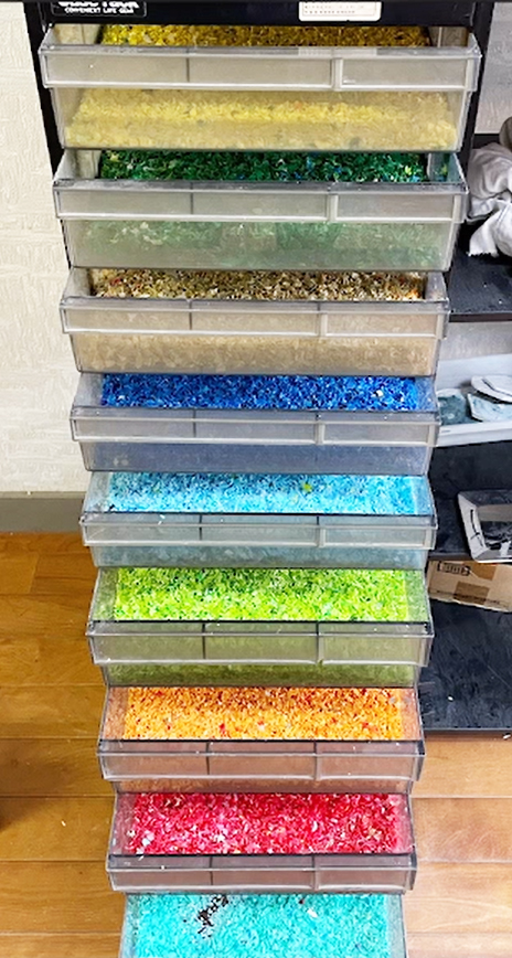砕いたペットボトルキャップのペレット(粒)を保存している棚。カラフルでしょ?