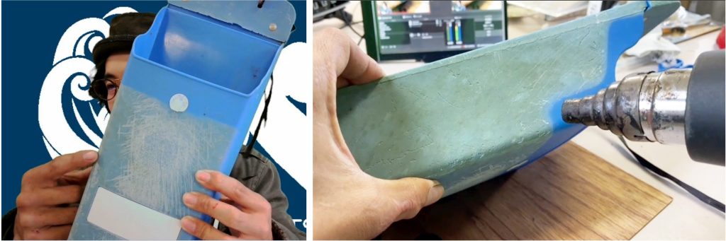 「これ(プラ溶接機)はガスの火が出るんじゃなくて、500~600℃の熱風が出ます。くっつけたい対象の両方を炙って、短冊を押し付けながら肉を盛っていく。ポリプロピレンと同様に、ポリエチレンとか塩ビはできるけど、他のプラスチックではうまくいかないこともありますね」