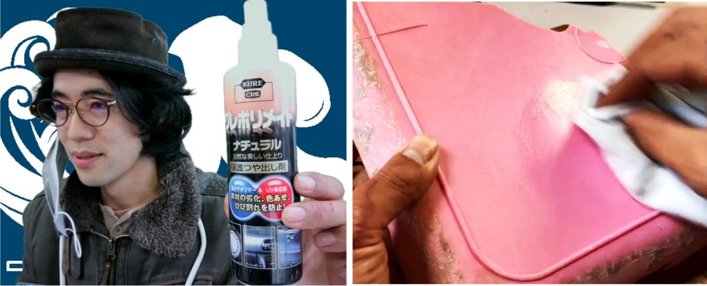炙る以外の再生の手段が、クレポリメイト。これはプラスチック復活剤などと呼ばれている艶出し材です。シリコンと対紫外線剤が入っていて、驚くほど表面が綺麗になります……が、対紫外線剤は大体有毒ですね」
