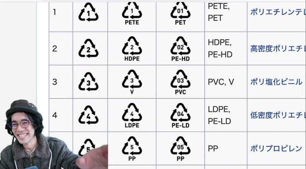 1番がこれはペットね。ペットボトル。PETとかPETEとかPETGなんかもある。添加物の種類によって変わります。