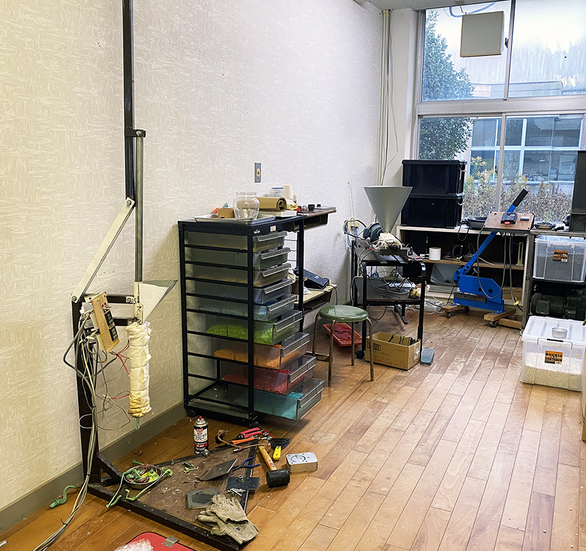 ぜひ見て欲しいものがある、とテンダーさんが見せたのは、ダイナミックラボにあるプラスチックを再利用するための機材を集めた部屋。なかにはプラスチックの破砕機や、プラスチックを砕いたペレット、射出成型機などが並んでいます。