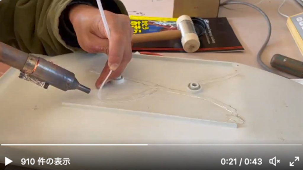 「これ(プラ溶接機)はガスの火が出るんじゃなくて、500~600℃の熱風が出ます。くっつけたい対象の両方を炙って、短冊を押し付けながら肉を盛っていく。ポリプロピレンと同様に、ポリエチレンとか塩ビはできるけど、他のプラスチックではうまくいかないこともありますね」