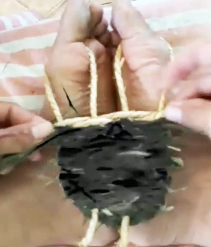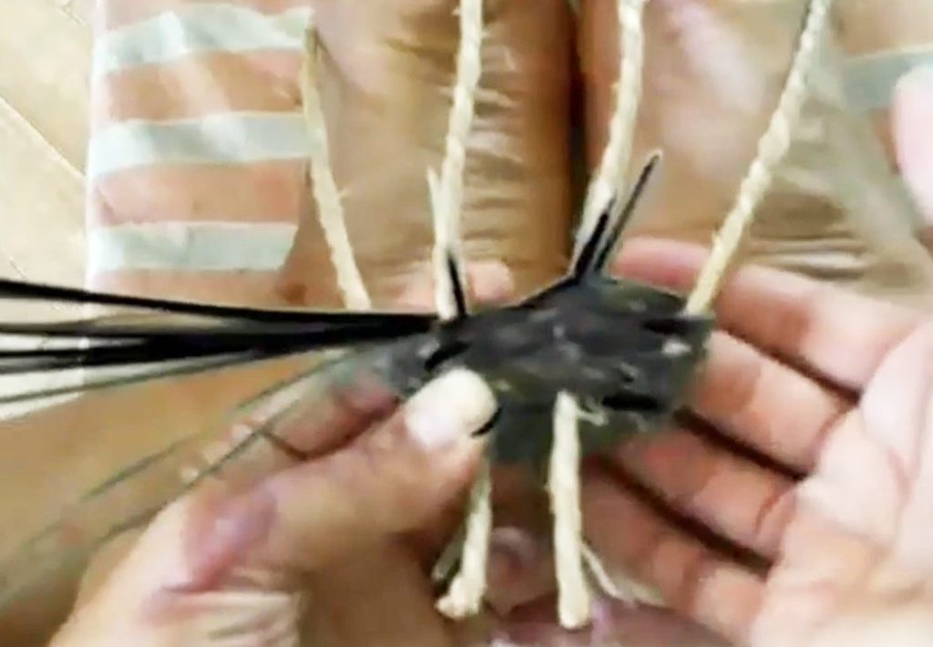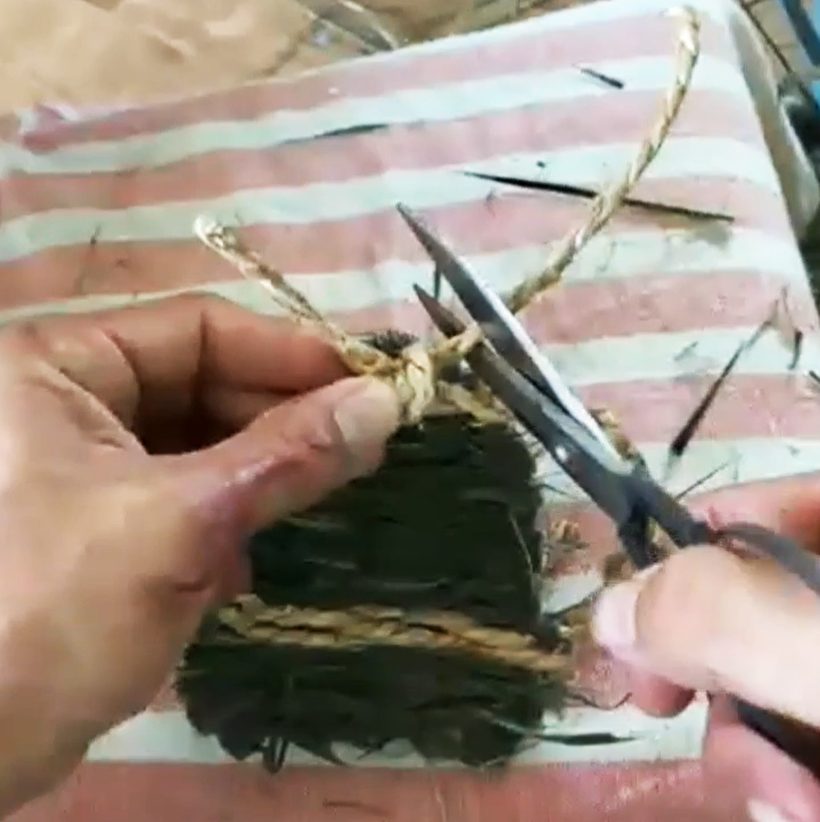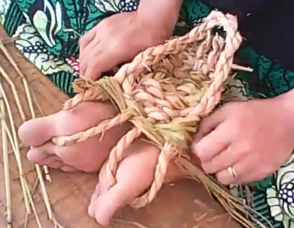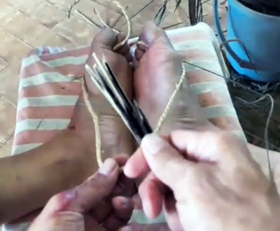 そういうとテンダーさんは紐を真ん中でふたつ折りにして足の指にかけ、紐に草の繊維をからませ始めました。