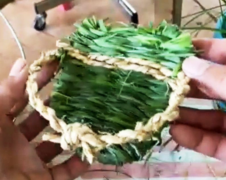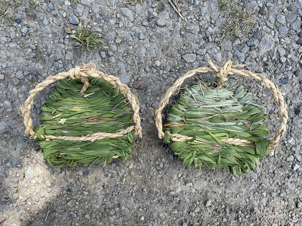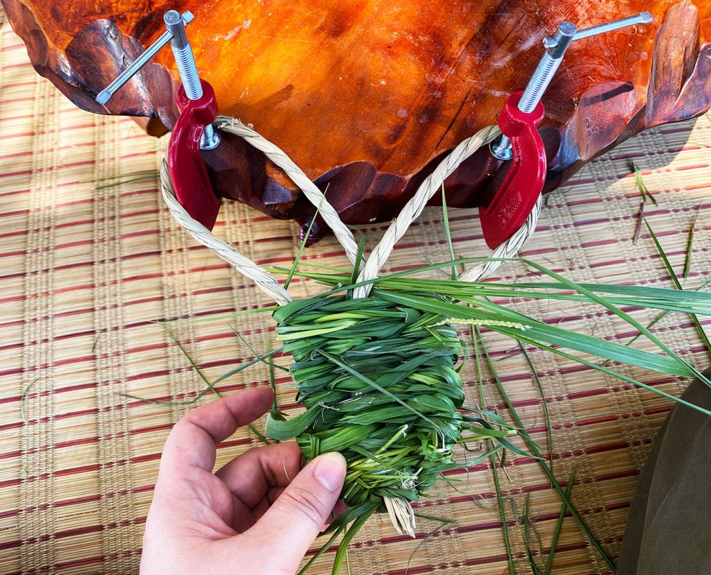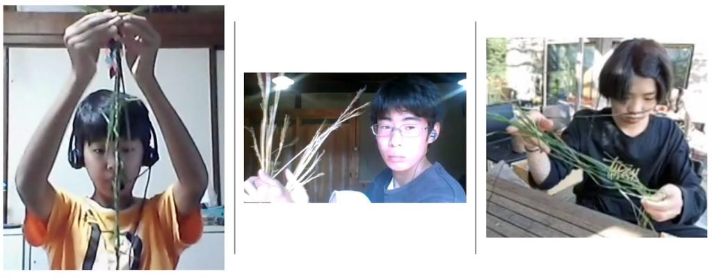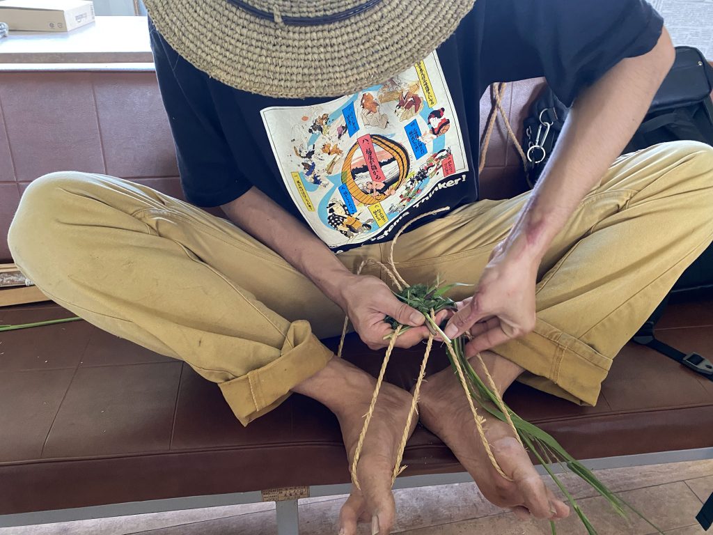 2本の箸を手にしたものの、1本ずつの回転の向きと2本の位置関係にとまどう参加者たち。とまどいを抱えたまま、素材を箸から草へと持ち替え、草に撚りをかけていきます。